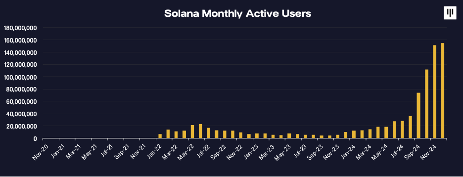 Users exploded as monthly active addresses hit160 million by December - a 26x increase from late 2023.