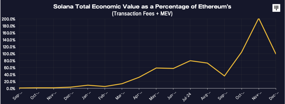 Solana's growth was so significant that its revenue began to surpass Ethereum's, generating 37% more revenue in Q4 compared to being just 2% of Ethereum's revenue in Q4 of the previous year. This highlights a meaningful gain in market share.