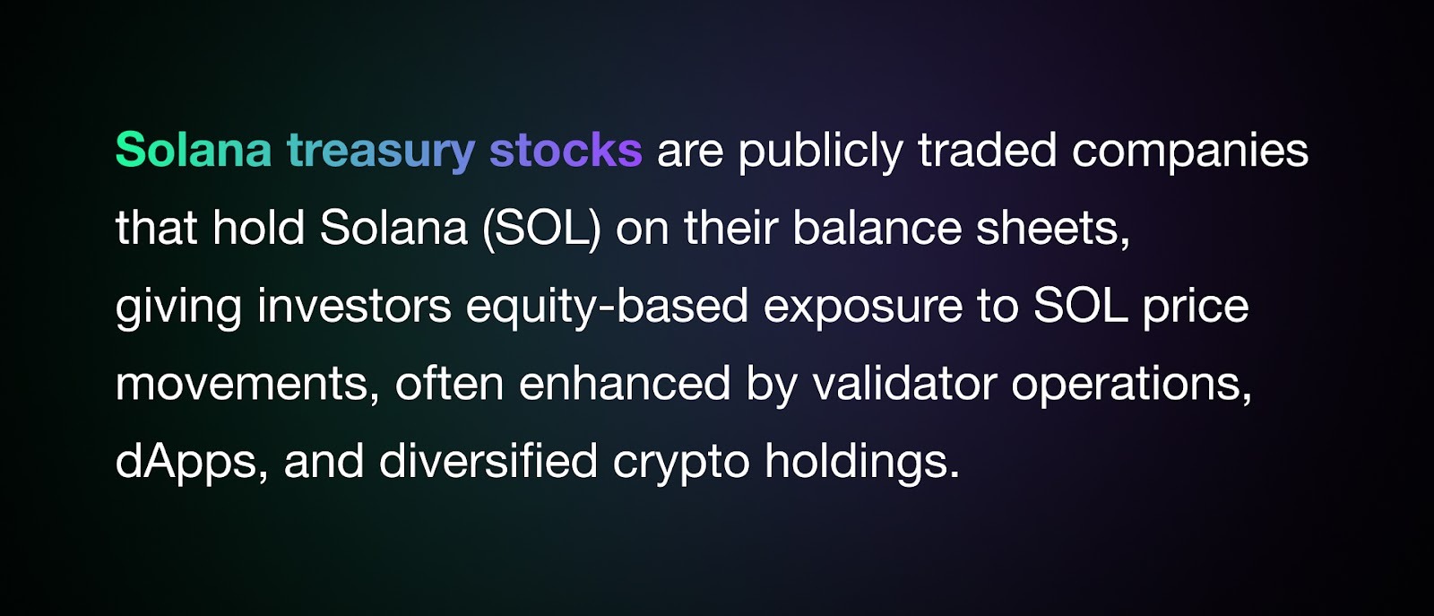 Solana treasury stocks are shares in public companies that hold SOL as an asset but are still regular stocks governed by standard securities rules. Traditional stocks get their value from their business operations, while these derive much of their value from crypto holdings. It's a way to get crypto exposure through a regulated wrapper, with different tax treatment, custody, and liquidity than if you just bought SOL directly. You own equity in the company, not the tokens themselves.